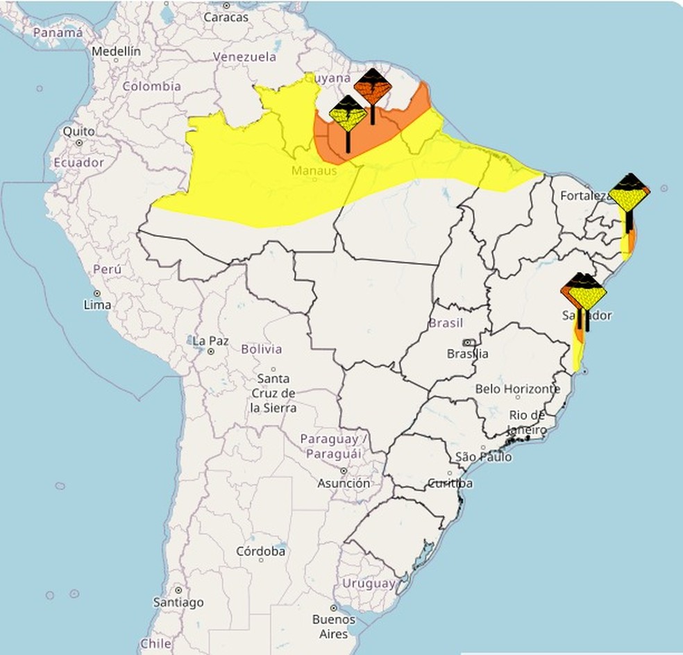 — No Nordeste,a previsão do tempo indica um volume de chuva significativo ao longo do dia na Bahia. Em alguns momentos,ela deve ficar de moderada a forte,e pode vir também com trovoadas. Chuvas também no litoral entre o Ceará,Paraíba e Pernambuco,justificadas pela entrada de umidade no oceano,por conta das chamadas "ondas de leste" — explica a especialista.