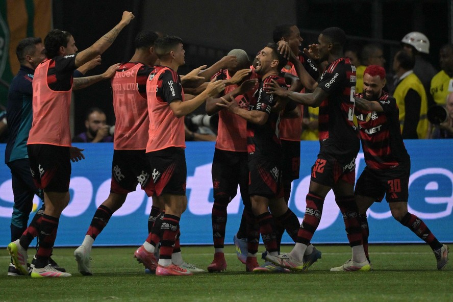 Arrascaeta comemora gol marcado contra o Palmeiras — Foto: Nelson ALMEIDA / AFP