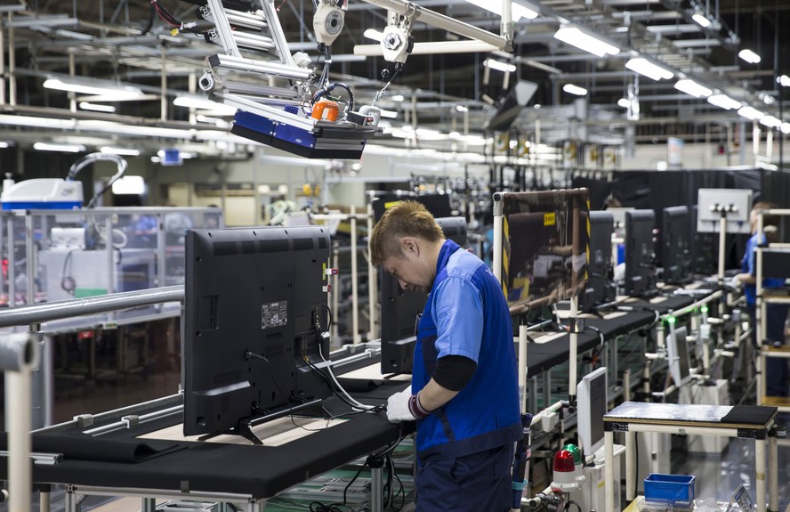 Trabalhador monta televisão de LCD na linha de produção do Centro de Inovação em Manufatura em Utsunomiya,Japão — Foto: Tomohiro Ohsumi/Bloomberg
