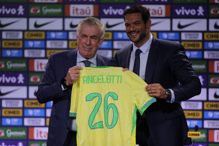 Carlo Ancelotti e Samir Xaud na apresentação e convocação do treinador da seleção brasileira — Foto: Alexandre Cassiano