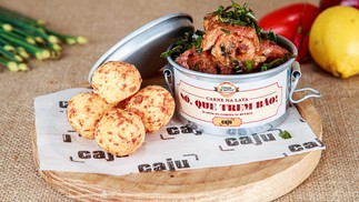 Caju Gastrobar: carne na lata com minimedalhões de mignon suíno com bacon e pão de queijo frito — Foto: Divulgação
