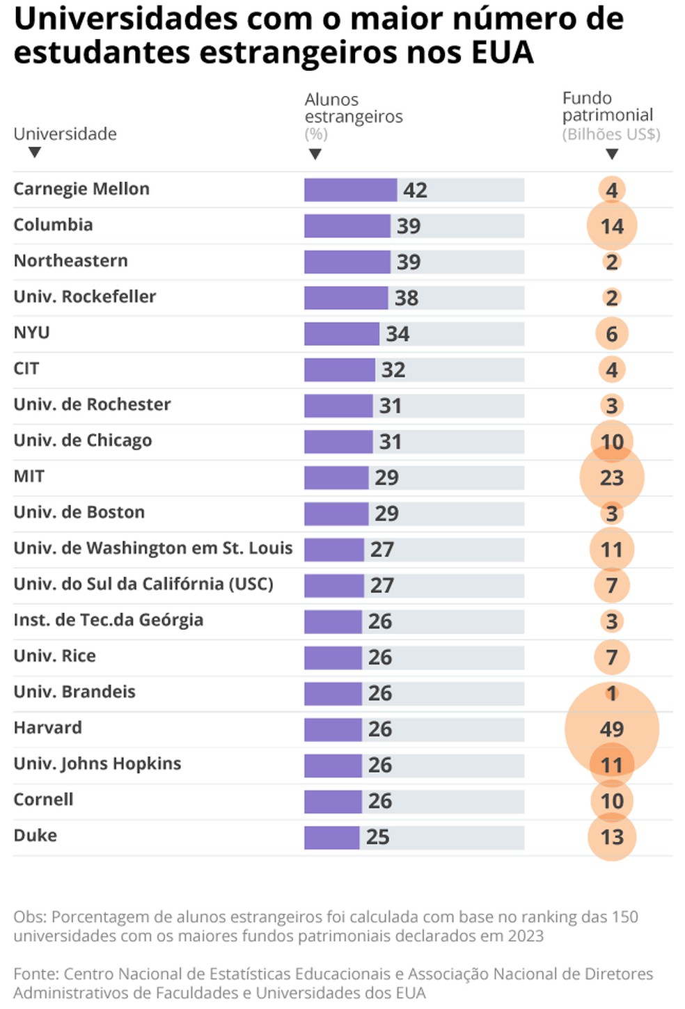 Segundo dados do Instituto de Educação Internacional dos EUA,o número de estudantes estrangeiros matriculados em faculdades americanas atingiu um recorde de 1,1 milhão no ano letivo de 2023-24,cerca de 6% do total no país. A concentração,no entanto,é ainda maior em universidades de elite,que respondem pelos maiores fundos patrimoniais. Na Universidade Columbia,integrante da prestigiosa Ivy League,eles ocupam quase 40% do corpo discente,enquanto em Harvard,representam um quarto do quadro de alunos. Trump,quer mudar as estatísticas: