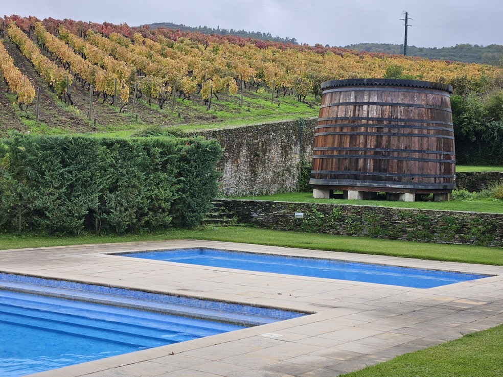 O hotel The Manor House,em Celeirós,tem sua piscina ao lado das vinhas e de um barril gigante — Foto: Rafael Galdo/O Globo